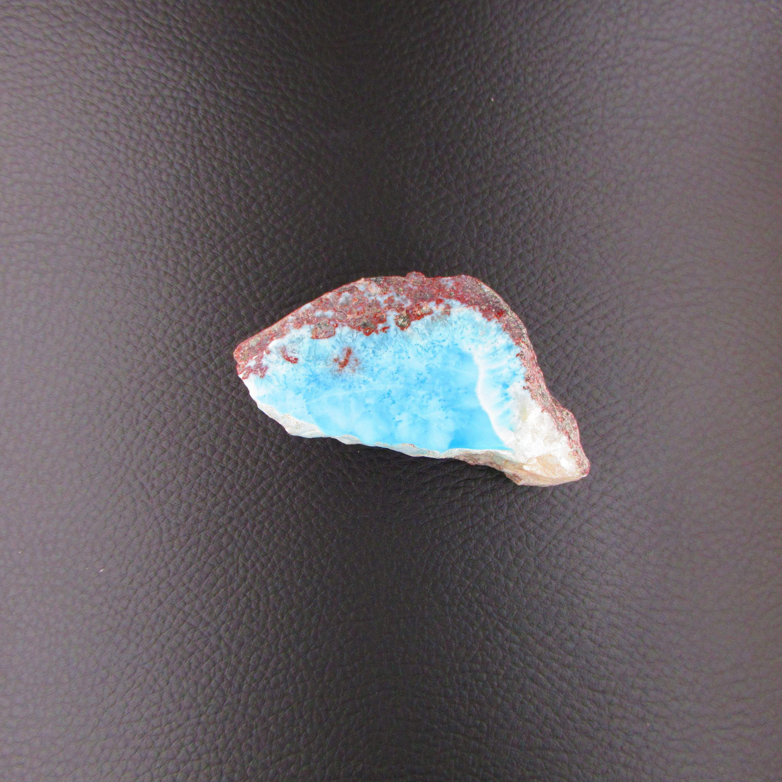 Magnifique pierre brute de Larimar de qualité A, polie sur une seule face afin de révéler toute la beauté de sa teinte bleu clair délicatement nuancée de blanc.
