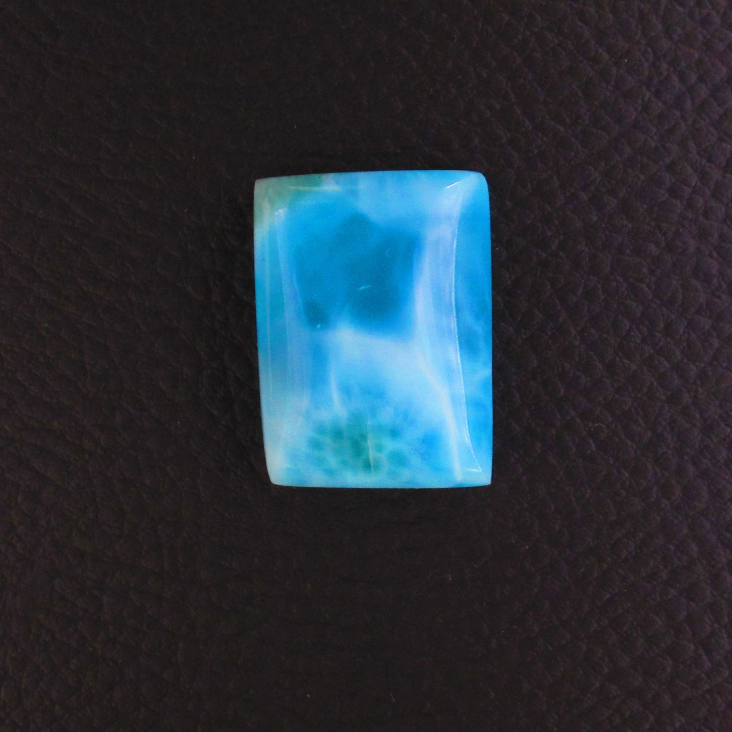 Somptueux cabochon en Larimar AAA taillé en rectangle, d’une teinte bleu soutenu rappelant la profondeur des lagons tropicaux.