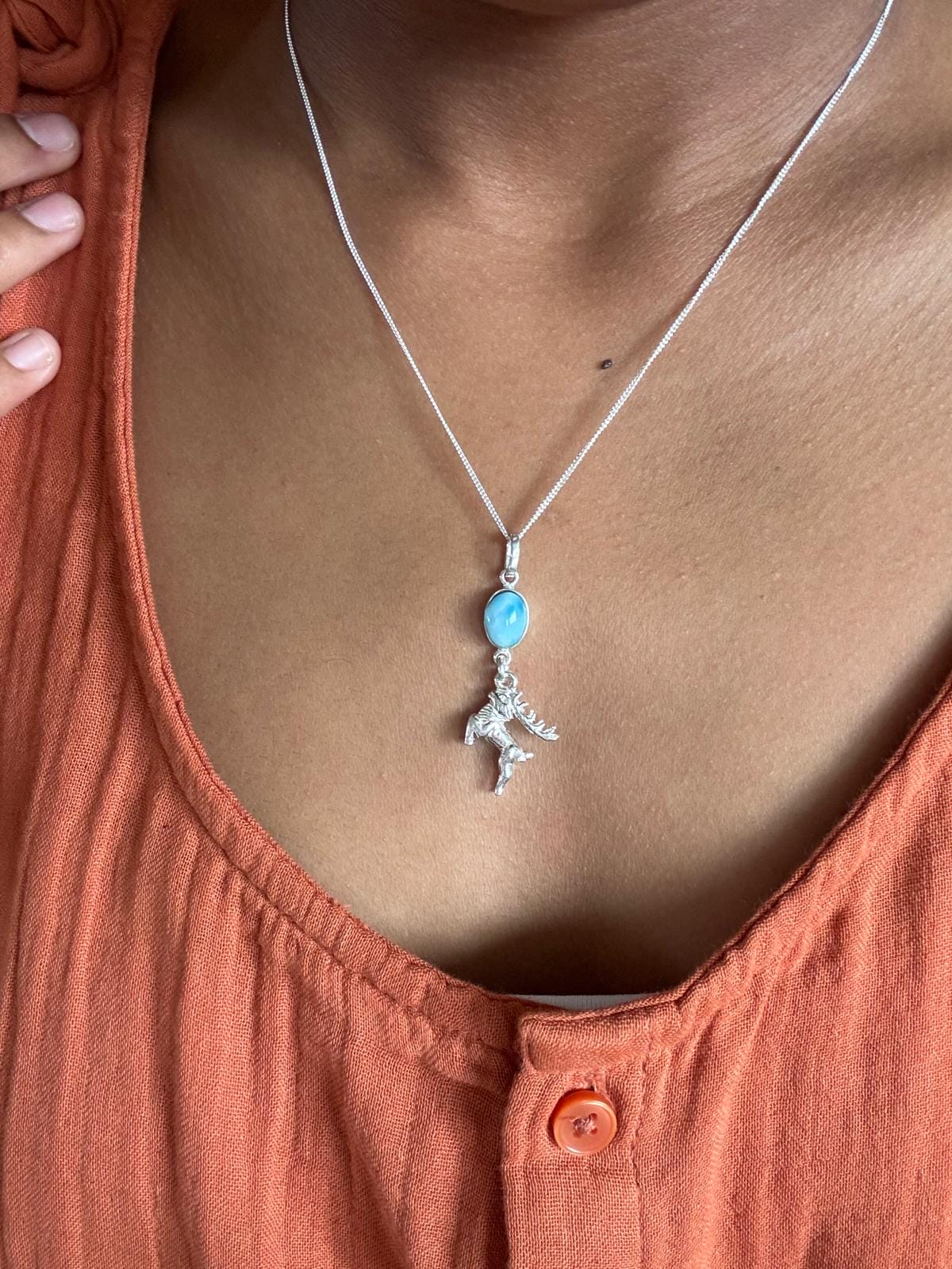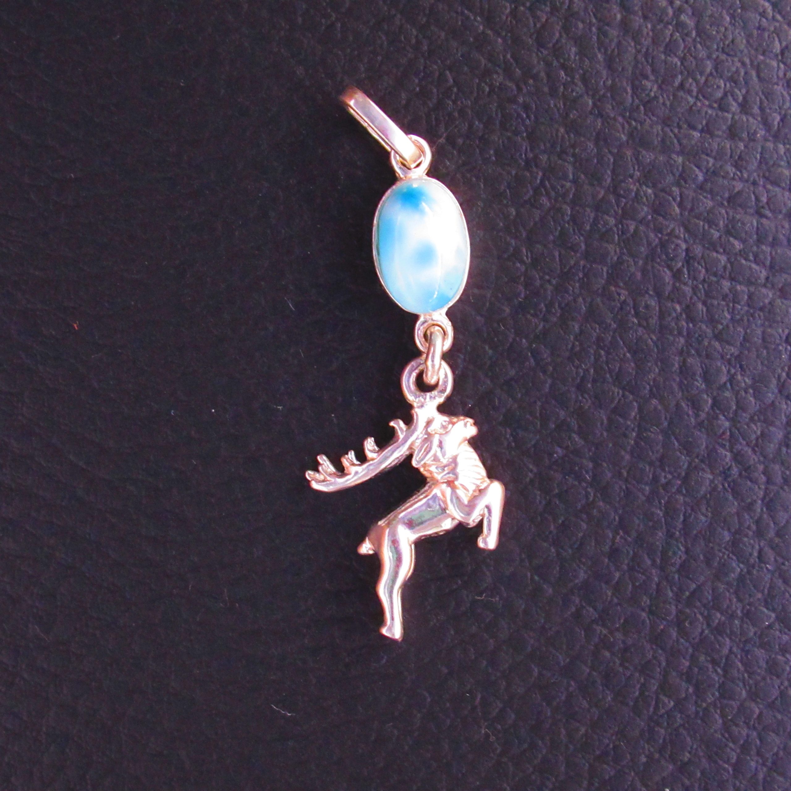 La pierre de Larimar AAA, d’un bleu clair éclatant, évoque les ciels purs des régions nordiques tandis que l’argent 925 met en valeur chaque détail du renne bondissant.